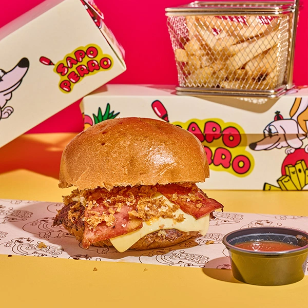 Hamburguesa sapo perro, la hamburguesa de la casa. tiene: mix de carnes premium, pan artesanal brioche, salsa showy, salsa de tocineta, papa ripio, lechuga romana, rodajas de tomate, tocineta y cebolla crispy + papas + bebida a elección.