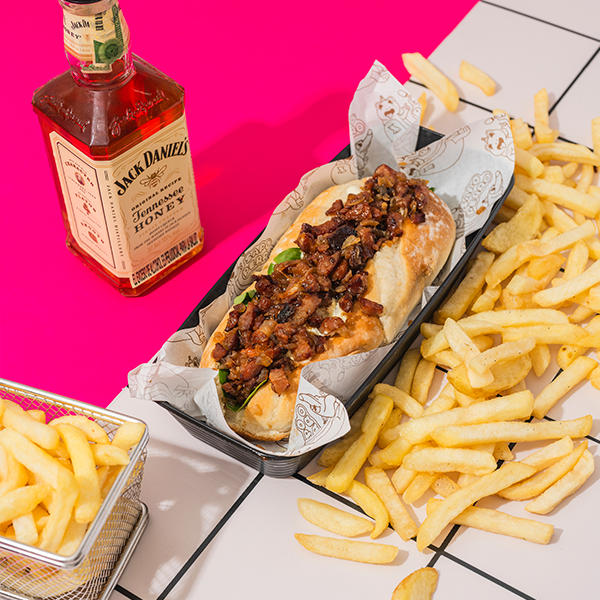 Perro caliente jack daniels, porción de papa a la francesa y bebida a elegir.